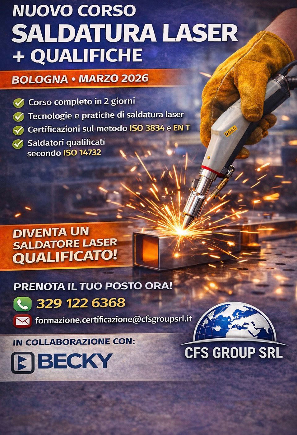 La tecnologia è nulla senza la competenza. Per questo, in collaborazione con CFS GROUP SRL e Becky, siamo lieti di presentarvi il nuovo Corso di Saldatura Laser + Qualifiche, che si terrà a Bologna a Marzo 2026.